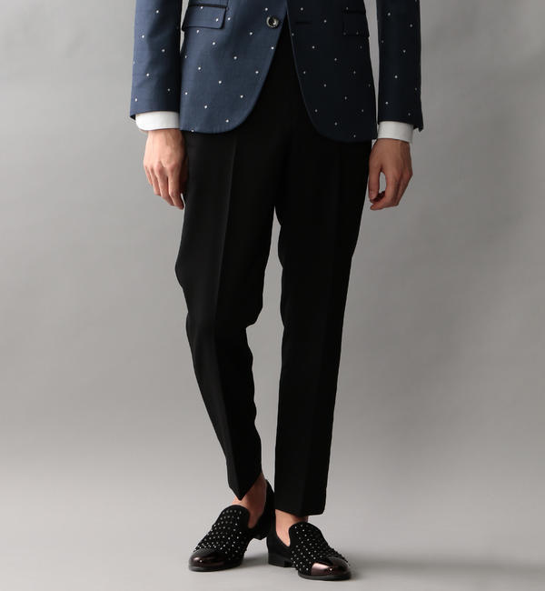 裾に向かい緩やかにテーパードさせたモードな印象のスラックスパンツ。シルクサテンを施した側章ラインがフォーマルな印象を加えるデザインポイント。シャツや、ニットと合わせたキレイめなスタイルに最適です。また、同素材のジャケット(商品番号:61D06890)やサテン衿で切り替えたベルベットジャケット(商品番号:61D09807)など、セットアップスタイルでのフォーマルコーディネートもオススメです。model:H178 B85 W70 H88 着用サイズ:79 ギルドプライム/GUILD PRIME パンツ|スラックス